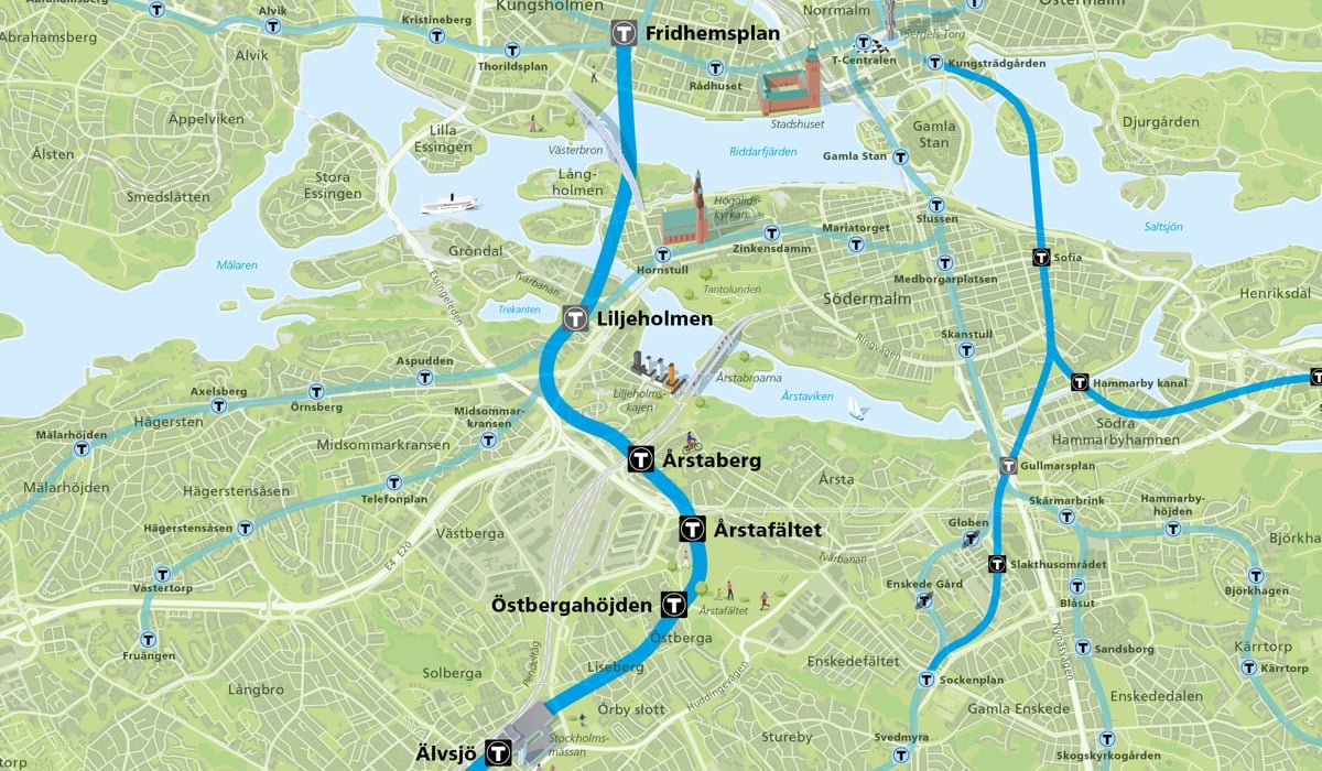 - Tunnelbana mellan Fridhemsplan och Älvsjö, med sex nya stationer