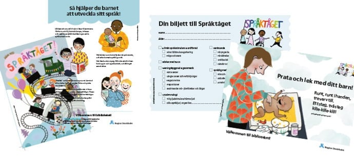 Biljett till Språktåget som fylls i av logopeder, och ges till familjer som tar med biljetten till biblioteket för att låna böcker. A5-format.